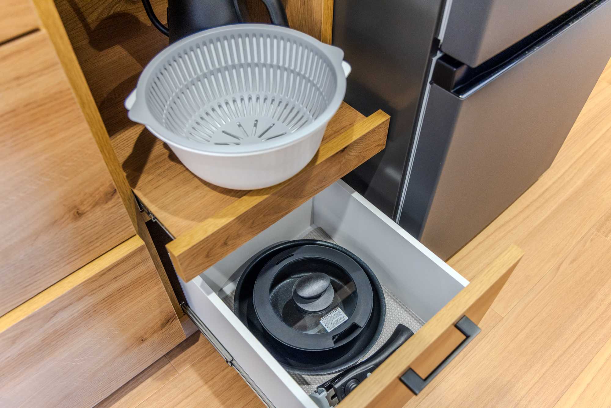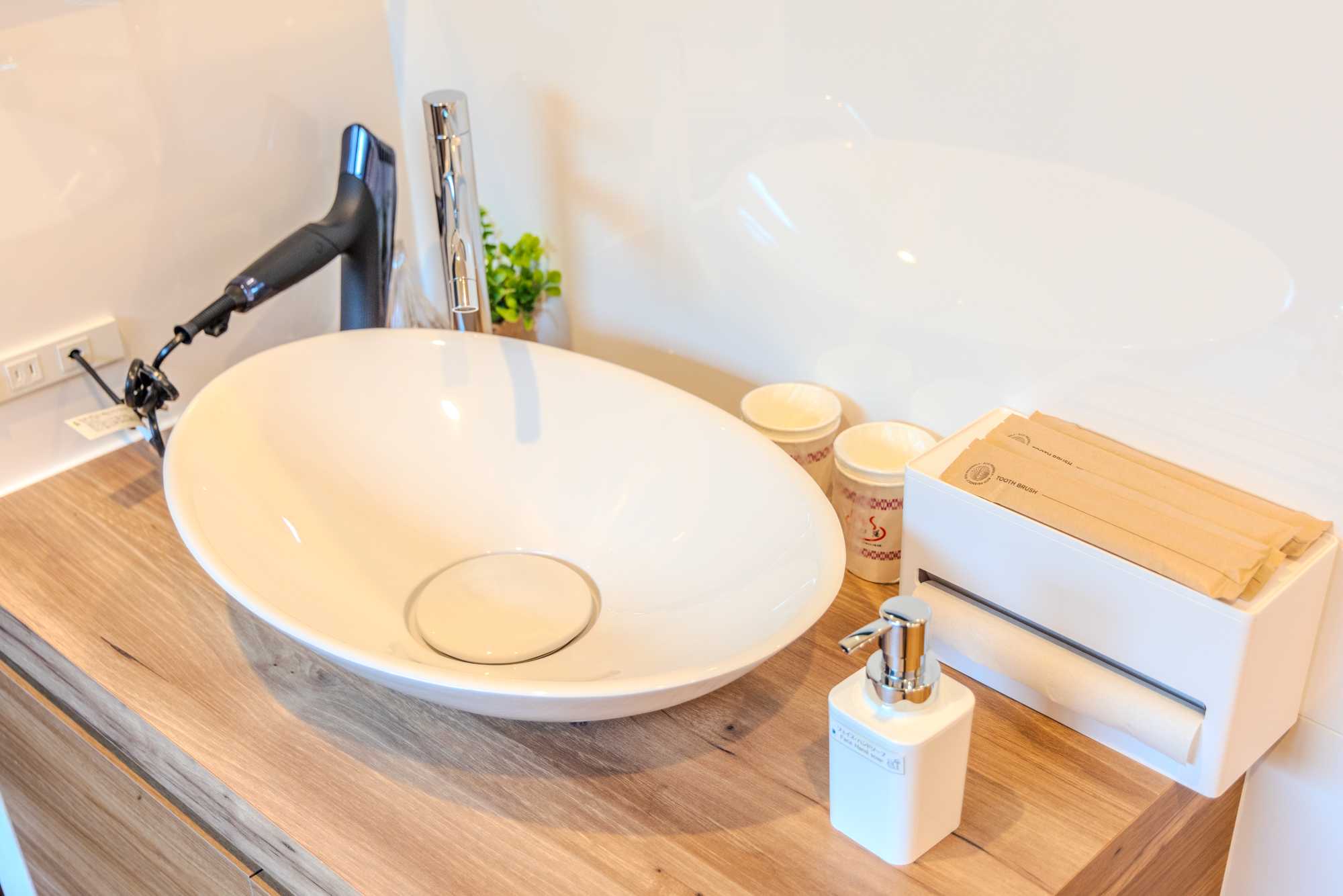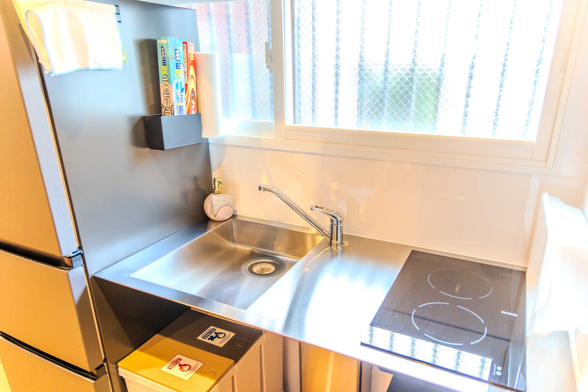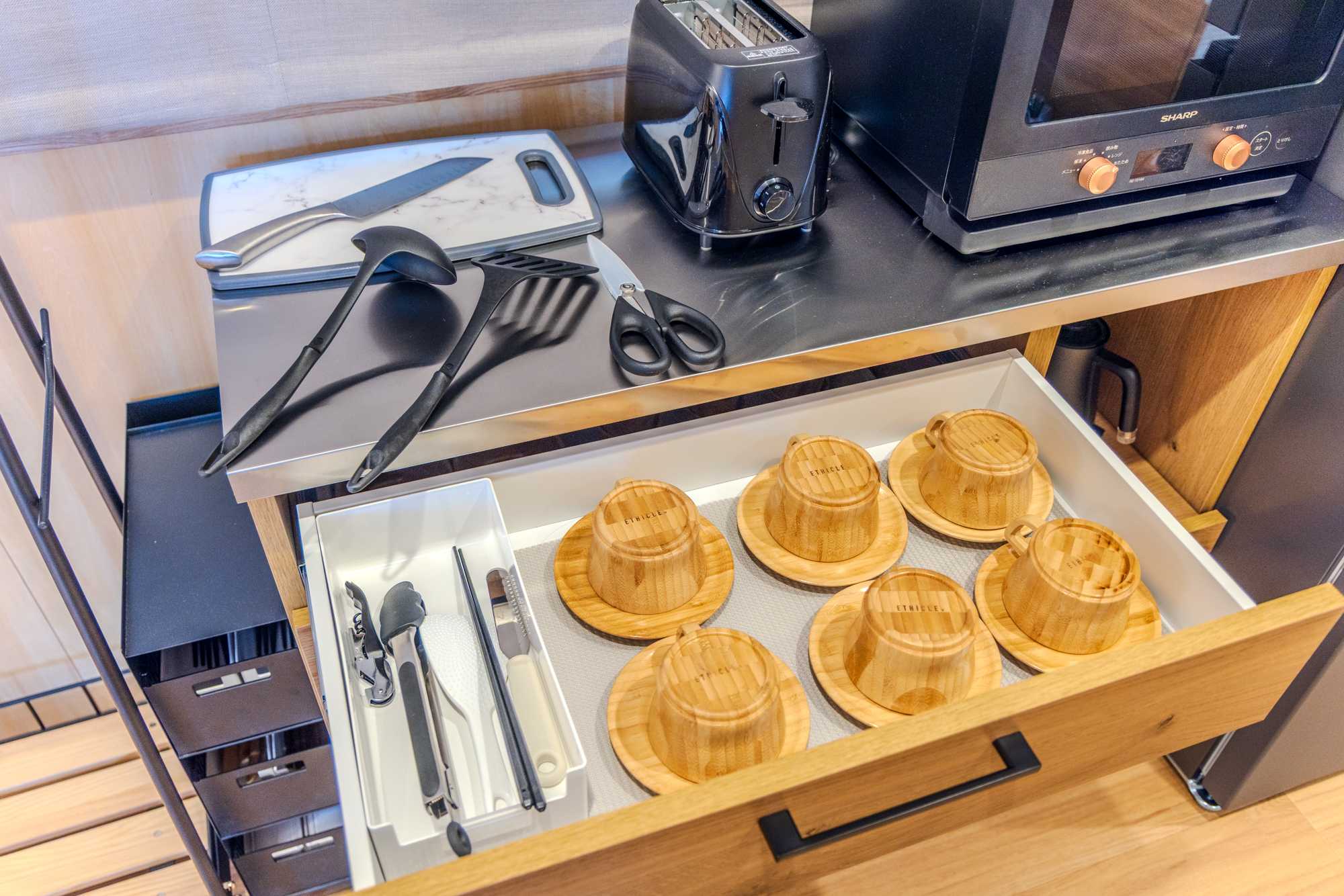 - フライパン、鍋セット/包丁、まな板/食器セット+マグ+グラス/スプーン、フォーク、ナイフ、箸/ワインオープナー+栓抜き/ラップ、アルミホイル、キッチンペーパー/食器用洗剤、スポンジ